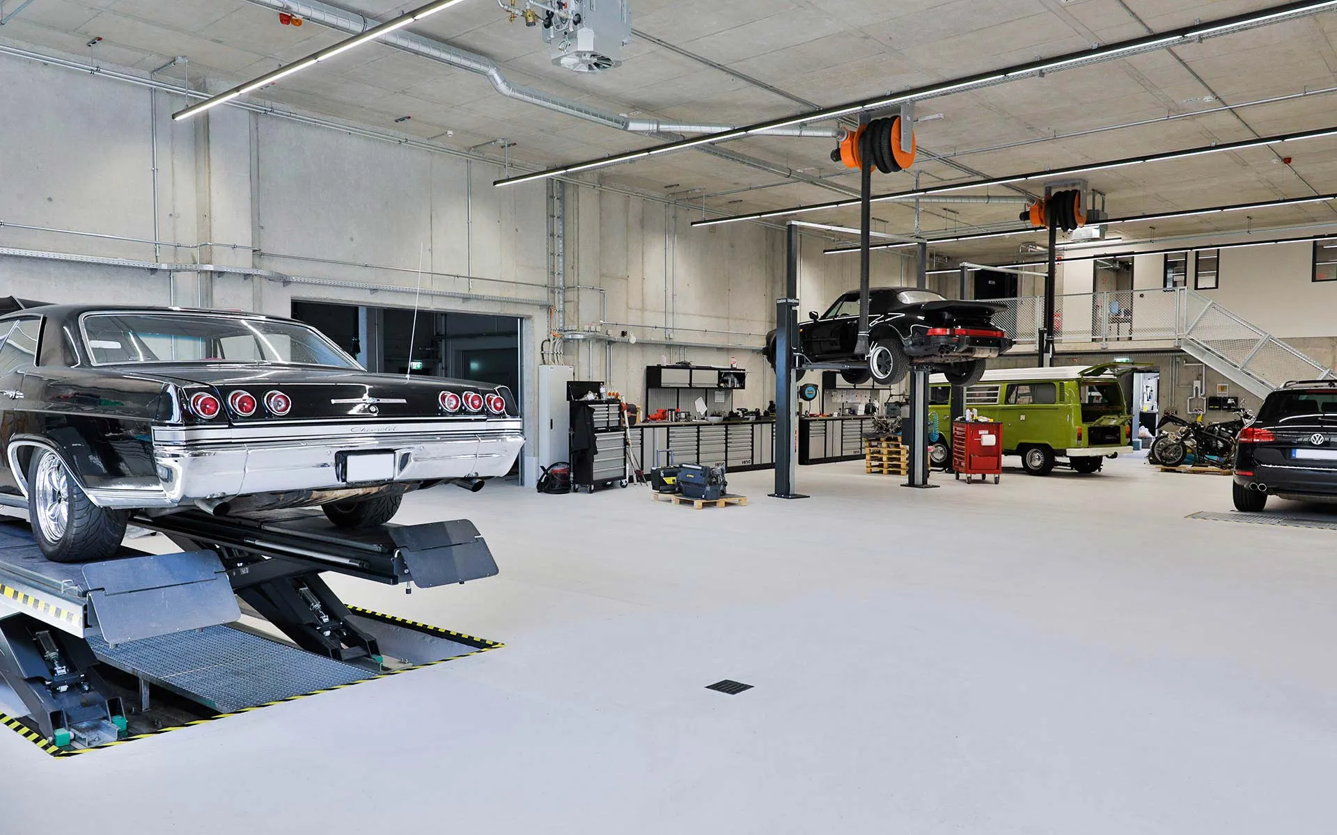 Carfactory Berlin offers professional vehicle storage with 115 secure garage boxes (5.85m x 2.90m) featuring 24/7 access, temperature control (12-15°C), and enhanced fire protection. Our facility accommodates classic cars, youngtimers, and collector vehicles with car lifts and automatic gate parking. We provide repair, painting, and maintenance services open to all vehicle types, whether you rent a garage box or use services independently. Maximum security and sophisticated access control ensure your vehicles remain protected.